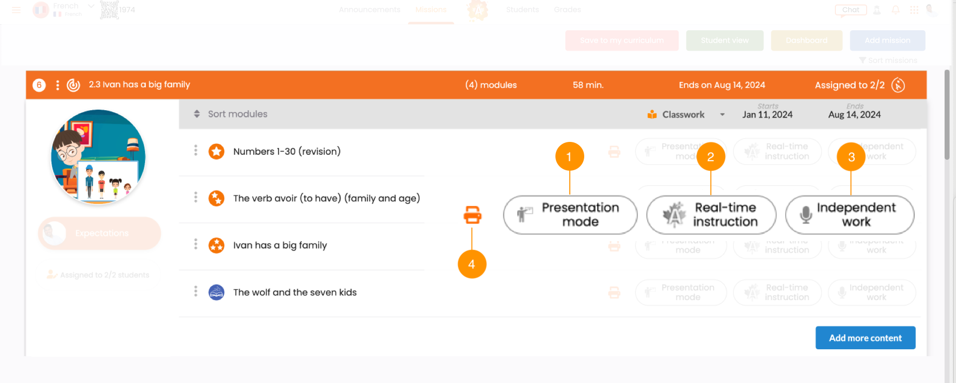 This mode allows you to teach and interact with every student in real time. It gives you total control over your class sequence and tempo, as well as your students' progress and performance.
