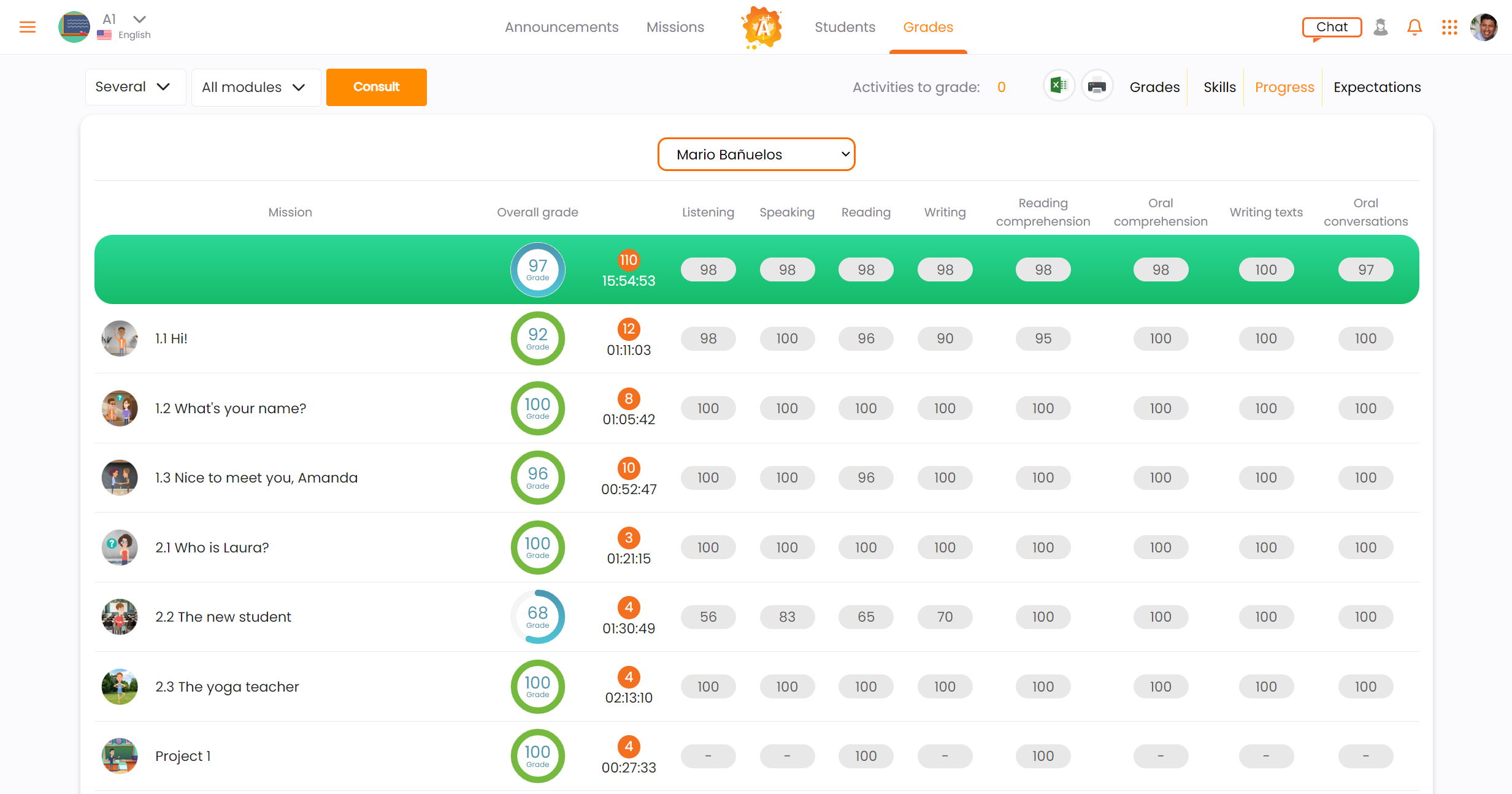 This report shows the student's competency in listening, speaking, reading, and writing, and in advanced skills: reading comprehension, oral comprehension, writing texts, and oral conversations.